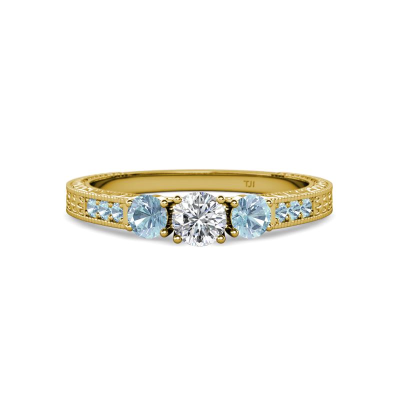 Round Diamond and Aquamarine 3/4 ctw Milgrain Womens Three Stone Engagement Ring with Aquamarine on Side Bar 14K Yellow Gold More Details ...