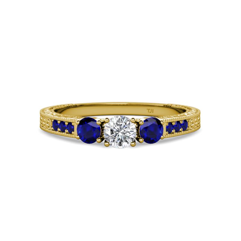 Round Diamond and Blue Sapphire 7/8 ctw Milgrain Womens Three Stone Engagement Ring with Blue Sapphire on Side Bar 14K Yellow Gold More Details ...