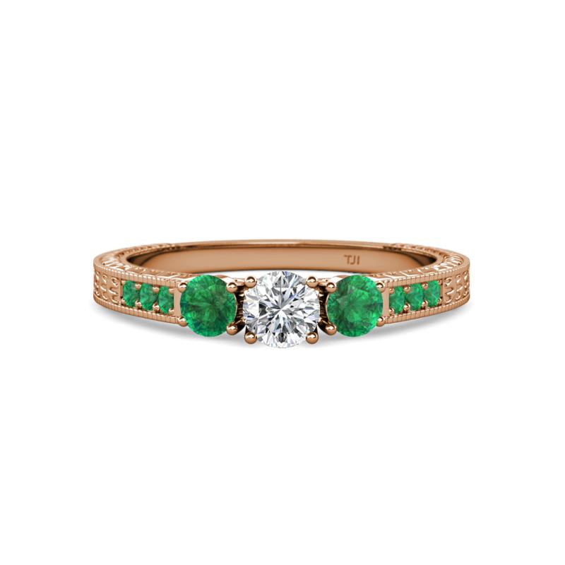 Round Diamond and Emerald 3/4 ctw Milgrain Womens Three Stone Engagement Ring with Emerald on Side Bar 14K Rose Gold More Details ...