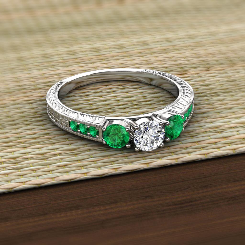 A stunning Center Diamond flanked by two Emerald shines with smaller round Emerald adorn this Milgrain Engagement Ring decorated with engraved edges making it look vintage and royal.