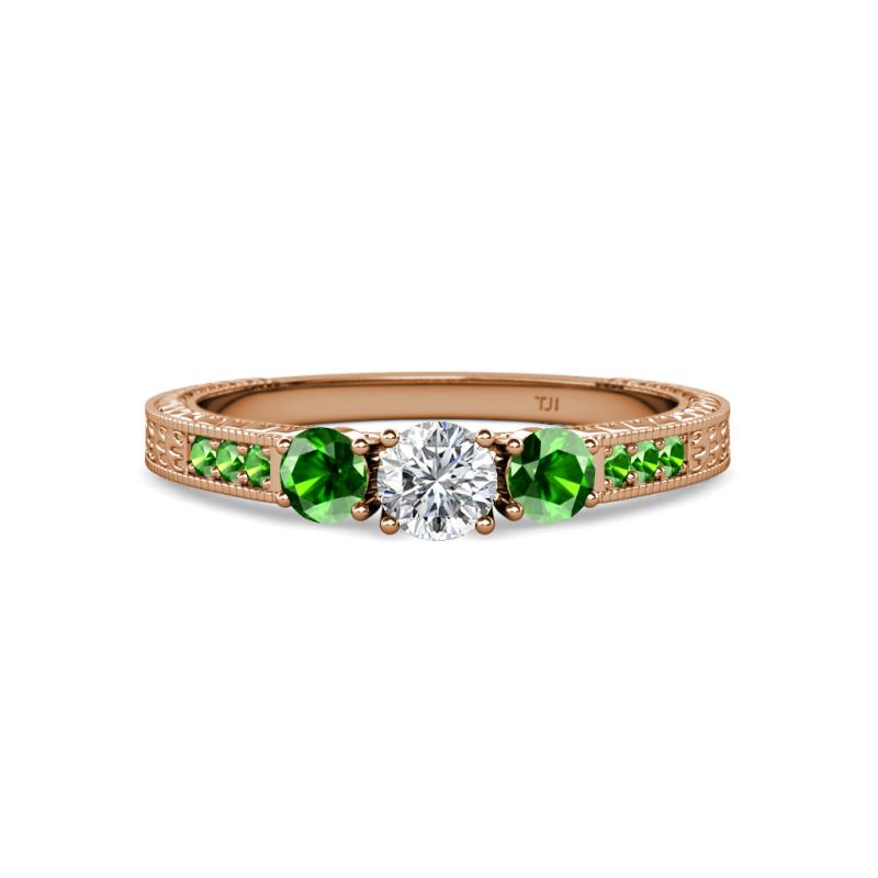 Round Diamond and Green Garnet 7/8 ctw Milgrain Womens Three Stone Engagement Ring with Green Garnet on Side Bar 14K Rose Gold More Details ...