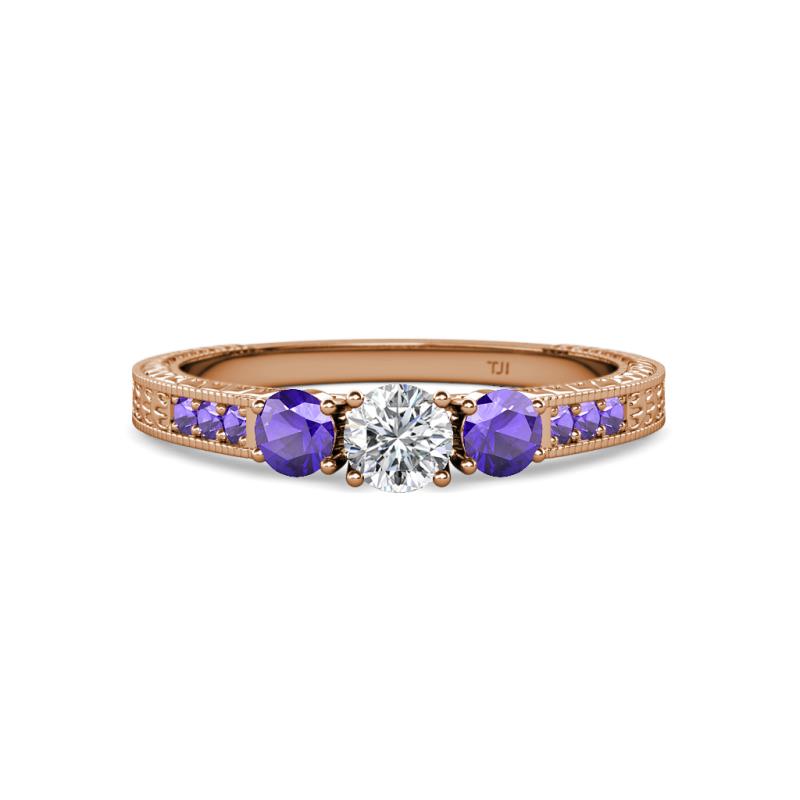 A stunning Center Diamond flanked by two Iolite shines with smaller round Iolite adorn this Milgrain Engagement Ring decorated with engraved edges making it look vintage and royal.