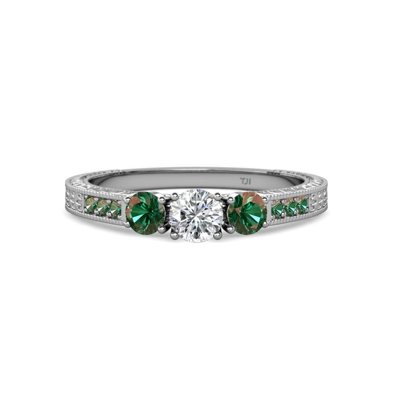 Round Diamond and Lab Created Alexandrite 7/8 ctw Milgrain Womens Three Stone Engagement Ring with Lab Created Alexandrite on Side Bar 14K White Gold More Details ...