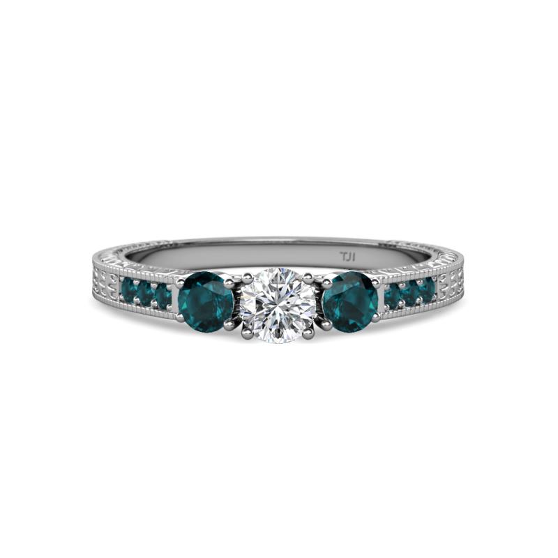 Round Diamond and London Blue Topaz 3/4 ctw Milgrain Womens Three Stone Engagement Ring with London Blue Topaz on Side Bar 14K White Gold More Details ...