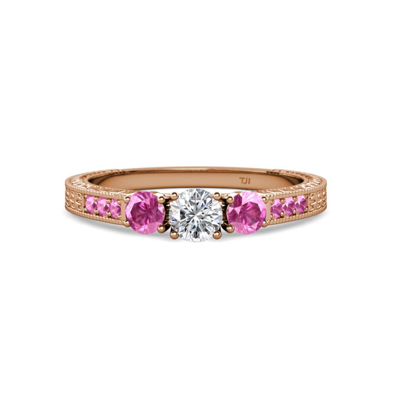 Round Diamond and Pink Sapphire 7/8 ctw Milgrain Womens Three Stone Engagement Ring with Pink Sapphire on Side Bar 14K Rose Gold More Details ...