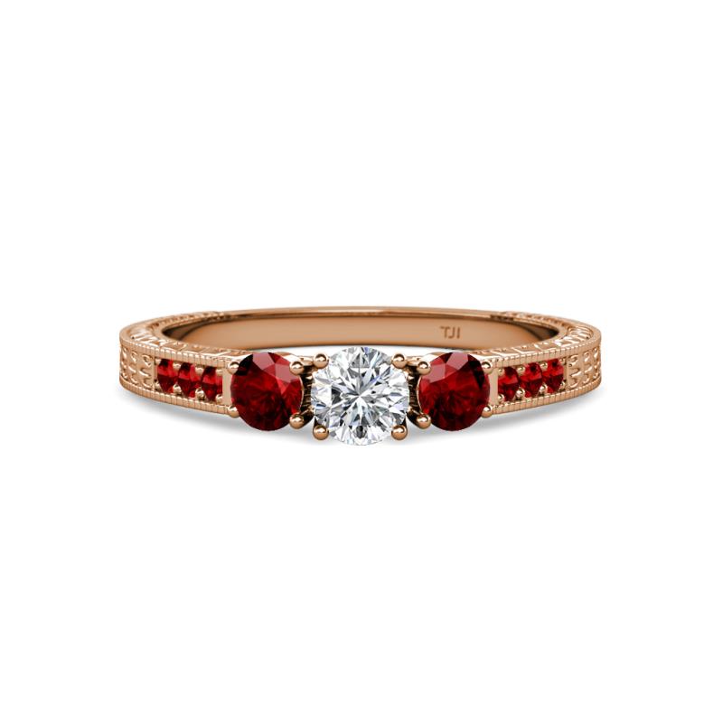 Round Diamond and Red Garnet 7/8 ctw Milgrain Womens Three Stone Engagement Ring with Red Garnet on Side Bar 14K Rose Gold More Details ...
