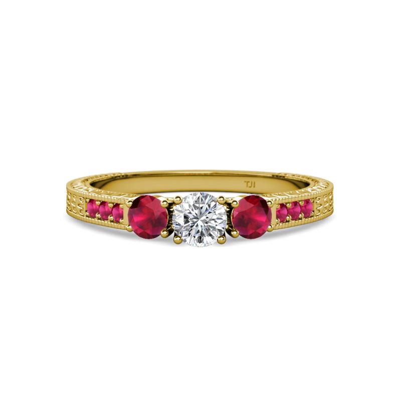 Round Diamond and Ruby 7/8 ctw Milgrain Womens Three Stone Engagement Ring with Ruby on Side Bar 14K Yellow Gold More Details ...