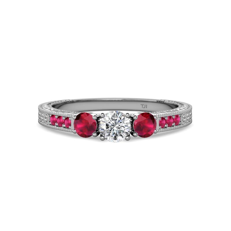 Round Diamond and Ruby 7/8 ctw Milgrain Womens Three Stone Engagement Ring with Ruby on Side Bar 14K White Gold More Details ...
