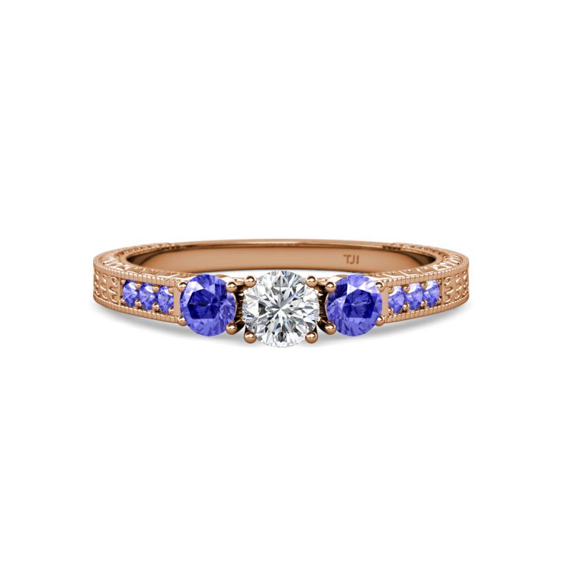 Round Diamond and Tanzanite 3/4 ctw Milgrain Womens Three Stone Engagement Ring with Tanzanite on Side Bar 14K Rose Gold More Details ...