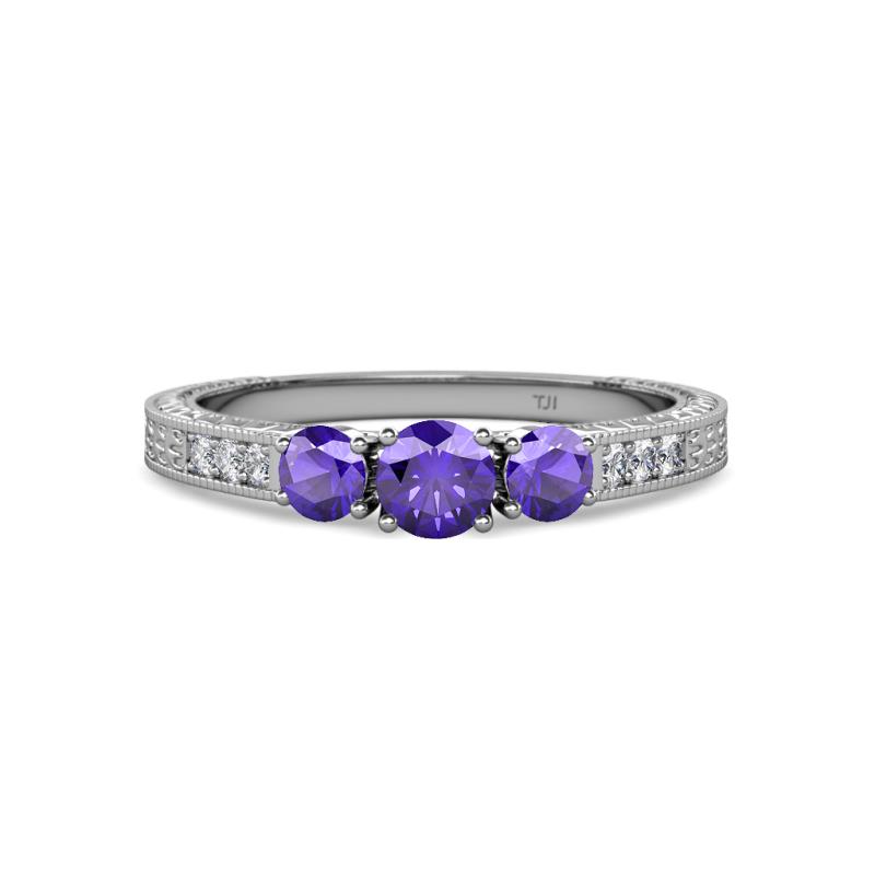 Round Iolite Milgrain Womens Three Stone Engagement Ring with Diamond on Side Bar 3/4 ctw 14K White Gold More Details ...