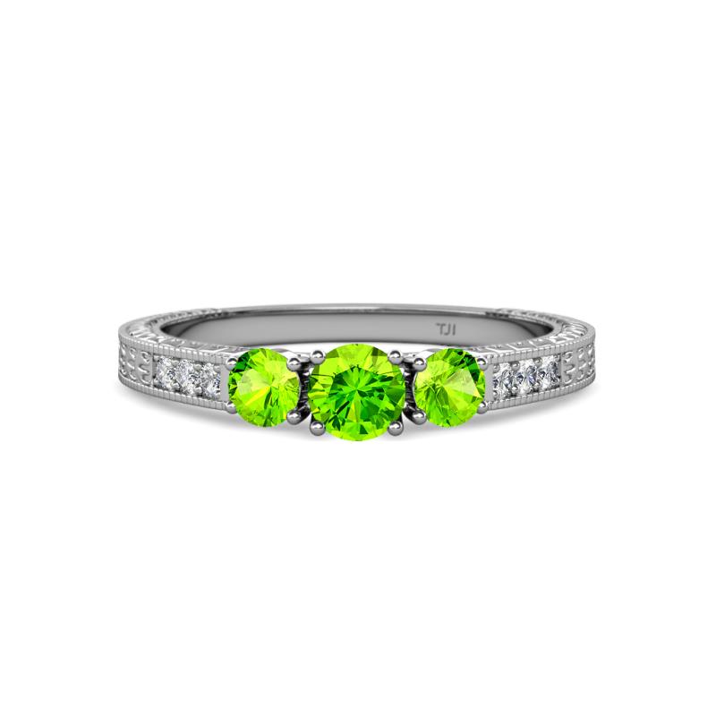 Round Peridot Milgrain Womens Three Stone Engagement Ring with Diamond on Side Bar 7/8 ctw 14K White Gold More Details ...