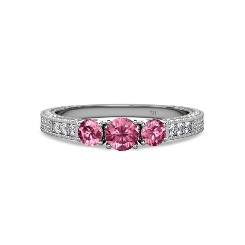 Round Pink Tourmaline Milgrain Womens Three Stone Engagement Ring with Diamond on Side Bar 3/4 ctw 14K White Gold More Details ...