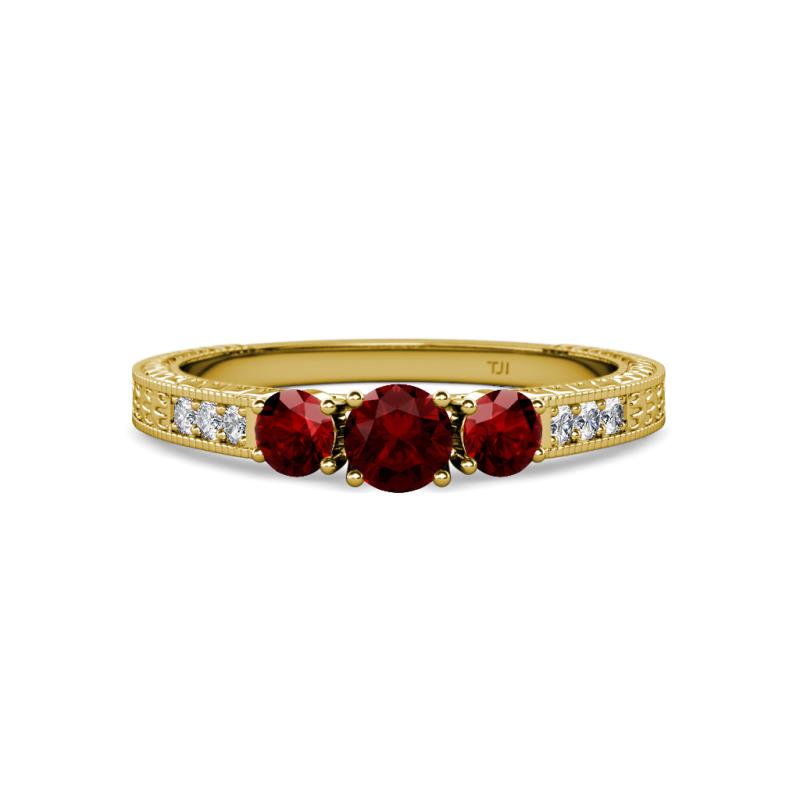 Round Red Garnet Milgrain Womens Three Stone Engagement Ring with Diamond on Side Bar 7/8 ctw 14K Yellow Gold More Details ...