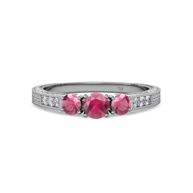 Round Rhodolite Garnet Milgrain Womens Three Stone Engagement Ring with Diamond on Side Bar 7/8 ctw 14K White Gold More Details ...