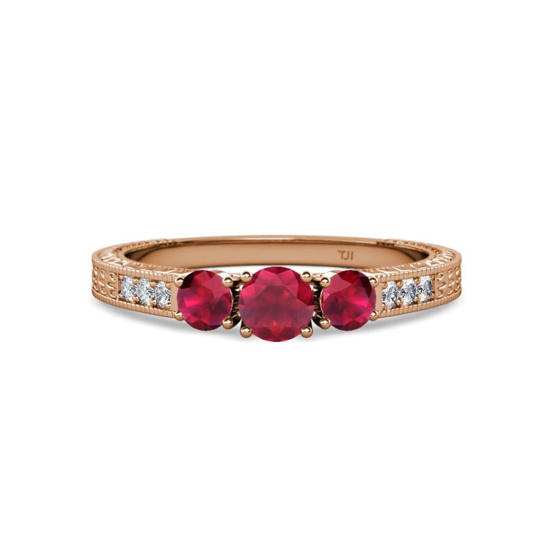 Round Ruby Milgrain Womens Three Stone Engagement Ring with Diamond on Side Bar 7/8 ctw 14K Rose Gold More Details ...