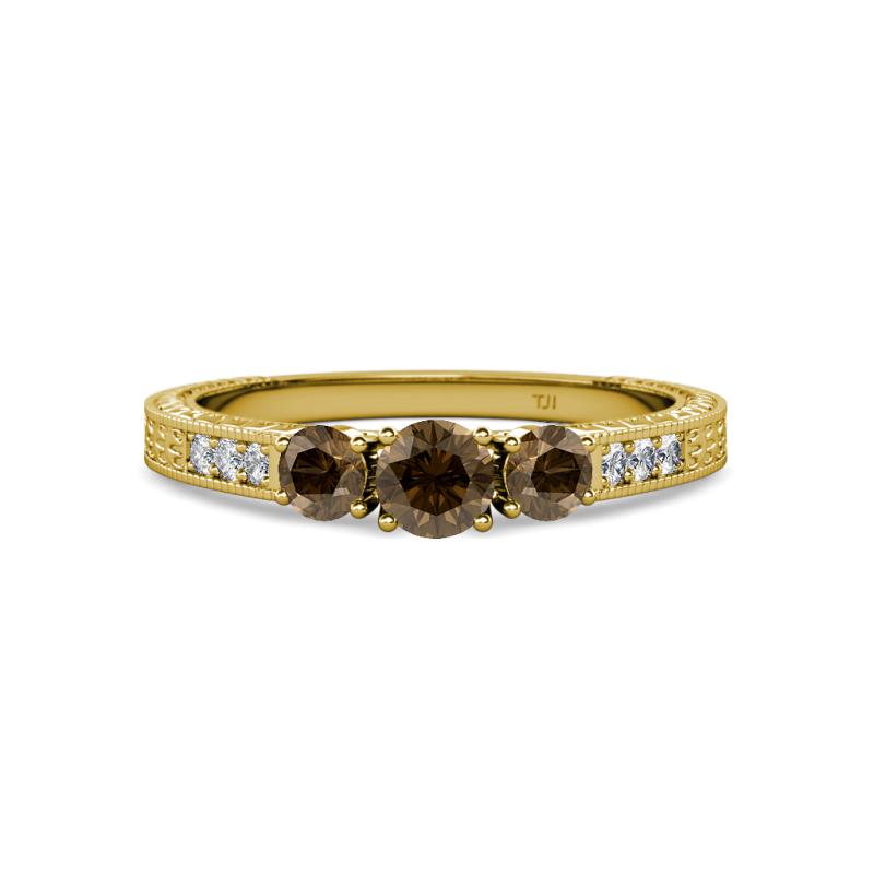 Round Smoky Quartz Milgrain Womens Three Stone Engagement Ring with Diamond on Side Bar 3/4 ctw 14K Yellow Gold More Details ...
