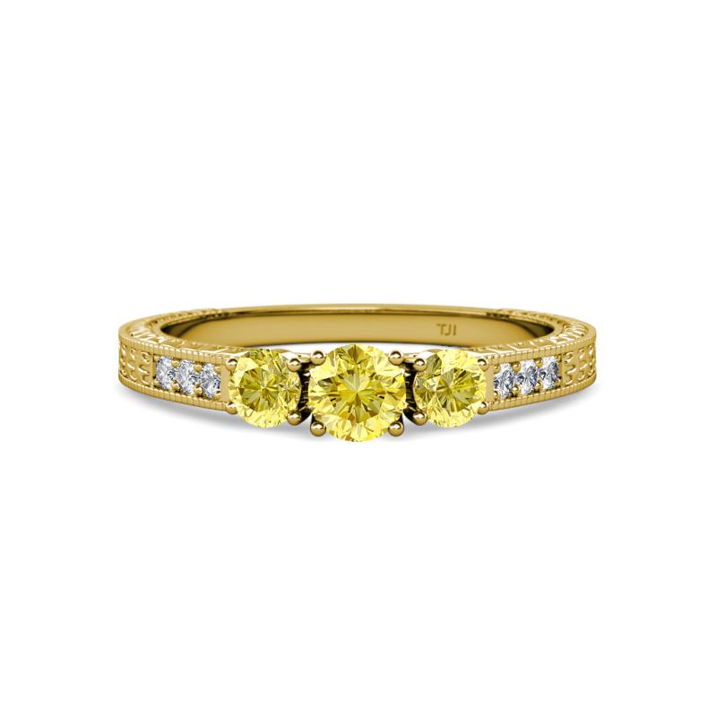 A stunning Center Yellow Sapphire flanked by two Yellow Sapphire shines with smaller round Diamond adorn this Milgrain Engagement Ring decorated with engraved edges making it look vintage and royal.