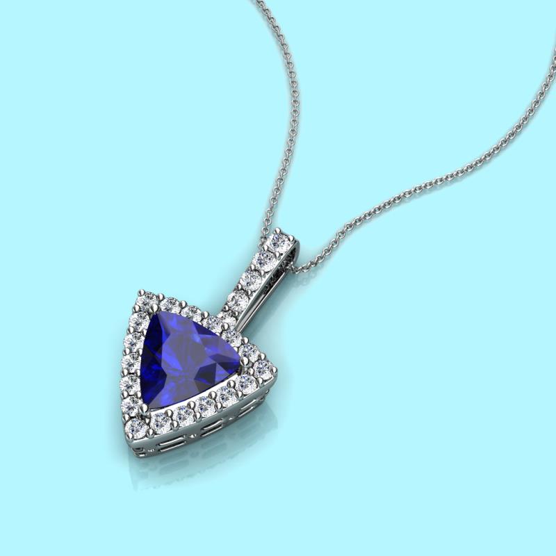 Simply spectacular, these gorgeous Pendant has Trillion Cut Lab Created Blue Sapphire accentuated by halo of Diamonds would make a cherished gift for a special someone. An elegant gift that will give a lifetime of joy, beauty and wear.