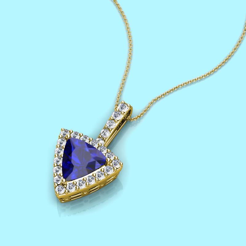 Trillion Cut Lab Created Blue Sapphire and Round Diamond 1 3/4 ctw Womens Halo Pendant Necklace 14K Yellow Gold.Included 16 Inches 14K Yellow Gold Chain More Details ...