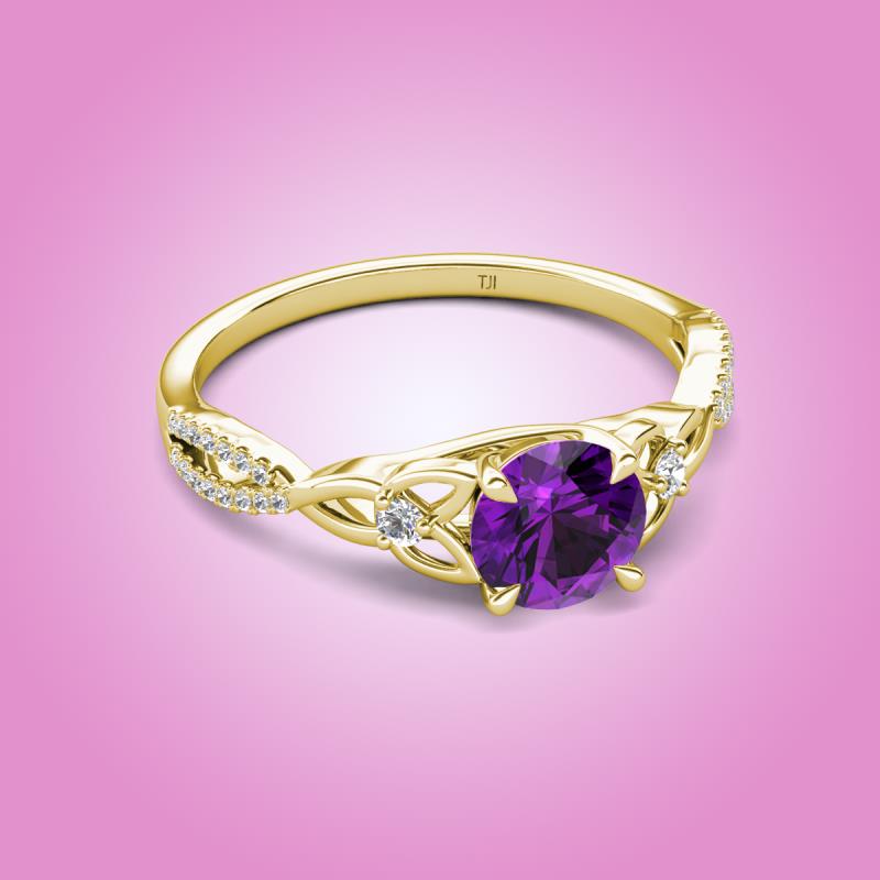 Round Amethyst set in Tiger Claw Four Prong and Side Round Natural Diamond of 1.08 ctw Women Celtic Love Knot Entwined Engagement Ring in 10K Yellow Gold More Details ...