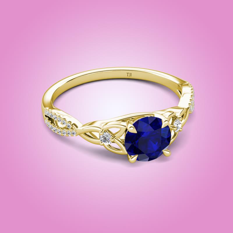 Round Blue Sapphire set in Tiger Claw Four Prong and Side Round Natural Diamond of 1.36 ctw Women Celtic Love Knot Entwined Engagement Ring in 10K Yellow Gold More Details ...