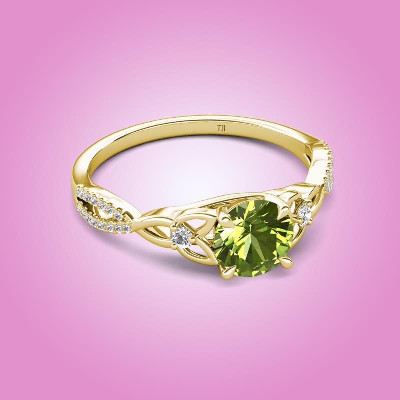 Let the souls bound by everlasting love with this Engagement ring of 1.31 ctw with center Round Peridot in Tiger Claw Prong setting and side Natural Diamond set on the Celtic Love Knot Entwined band in a prong setting.