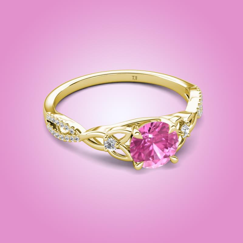 Round Pink Sapphire set in Tiger Claw Four Prong and Side Round Natural Diamond of 1.31 ctw Women Celtic Love Knot Entwined Engagement Ring in 14K Yellow Gold More Details ...