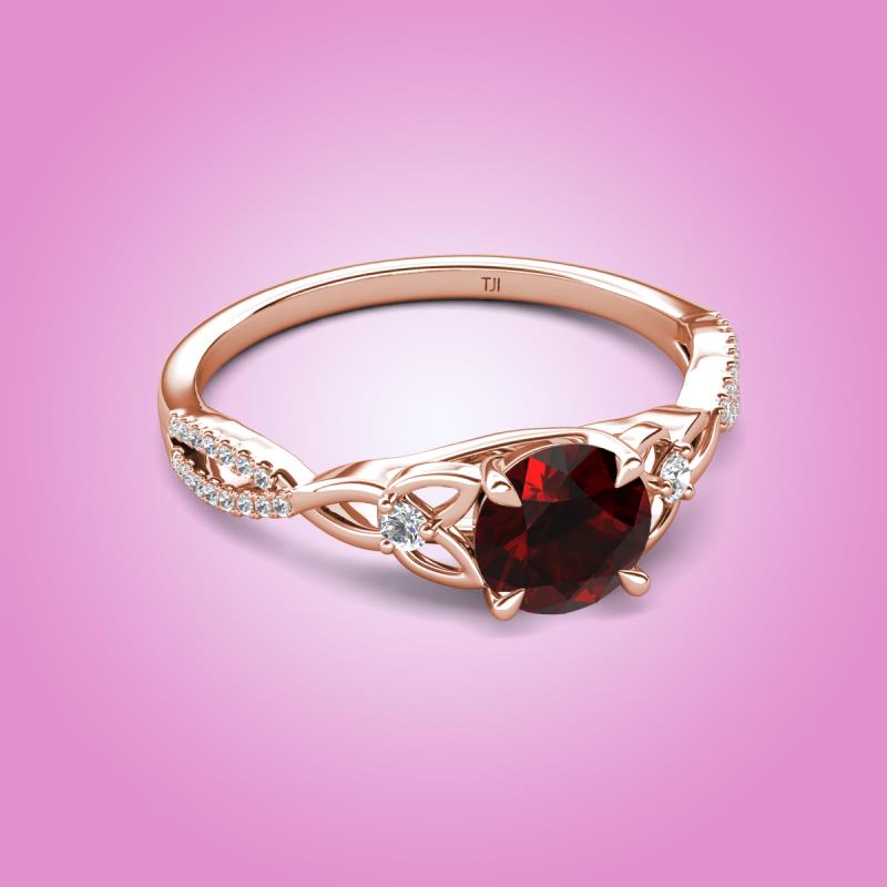 Round Red Garnet set in Tiger Claw Four Prong and Side Round Natural Diamond of 1.26 ctw Women Celtic Love Knot Entwined Engagement Ring in 14K Rose Gold More Details ...