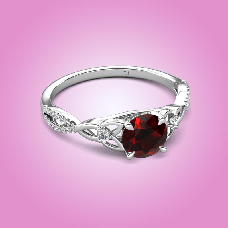 Let the souls bound by everlasting love with this Engagement ring of 1.26 ctw with center Round Red Garnet in Tiger Claw Prong setting and side Natural Diamond set on the Celtic Love Knot Entwined band in a prong setting.