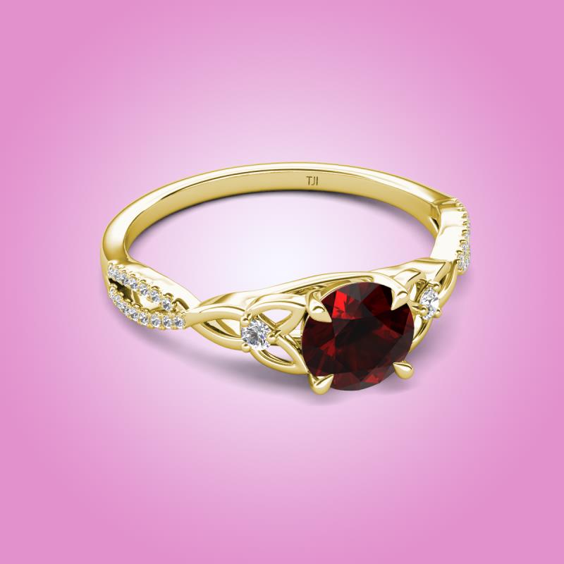 Round Red Garnet set in Tiger Claw Four Prong and Side Round Natural Diamond of 1.26 ctw Women Celtic Love Knot Entwined Engagement Ring in 18K Yellow Gold More Details ...