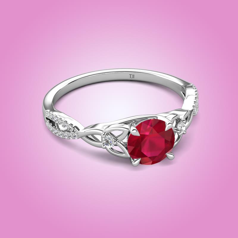 Let the souls bound by everlasting love with this Engagement ring of 1.16 ctw with center Round Ruby in Tiger Claw Prong setting and side Natural Diamond set on the Celtic Love Knot Entwined band in a prong setting.