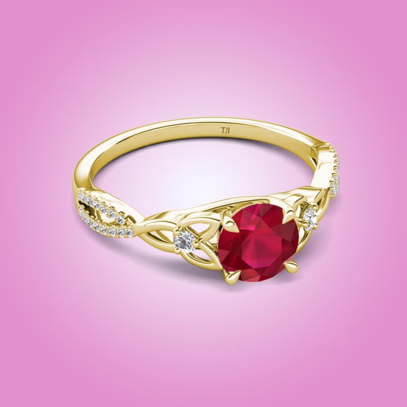 Round Ruby set in Tiger Claw Four Prong and Side Round Natural Diamond of 1.16 ctw Women Celtic Love Knot Entwined Engagement Ring in 10K Yellow Gold More Details ...