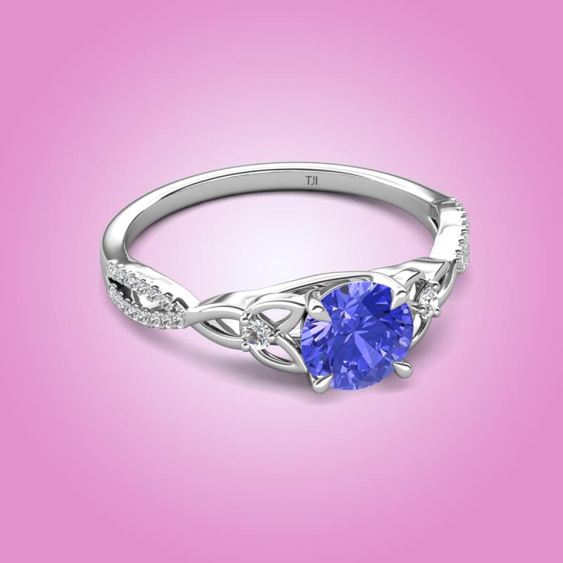 Let the souls bound by everlasting love with this Engagement ring of 1.13 ctw with center Round Tanzanite in Tiger Claw Prong setting and side Natural Diamond set on the Celtic Love Knot Entwined band in a prong setting.