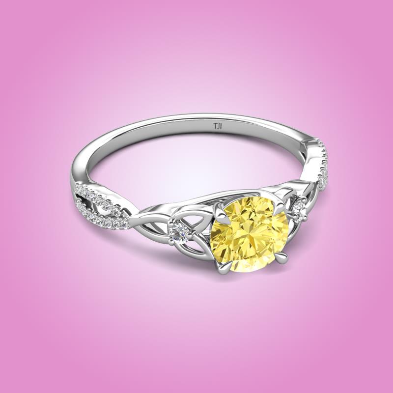 Let the souls bound by everlasting love with this Engagement ring of 1.16 ctw with center Round Yellow Sapphire in Tiger Claw Prong setting and side Natural Diamond set on the Celtic Love Knot Entwined band in a prong setting.