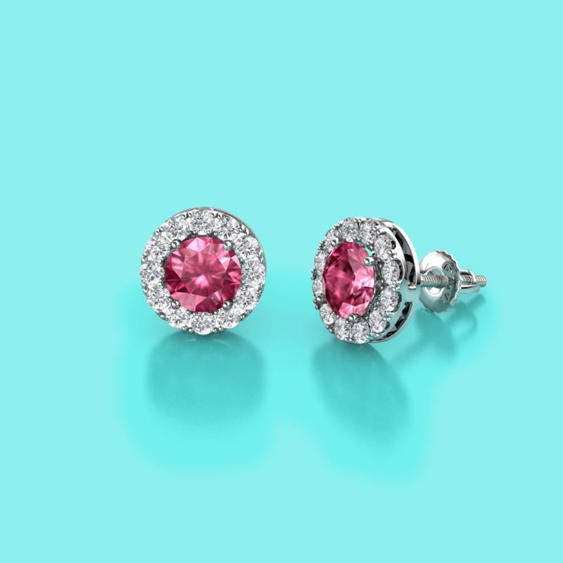 This is a Beautiful 0.76 ctw Halo Style Studs features Center Pink Tourmaline & surrounded with Small Round Diamond which are designed to add a touch of Style and Elegance to just about any Outfit.