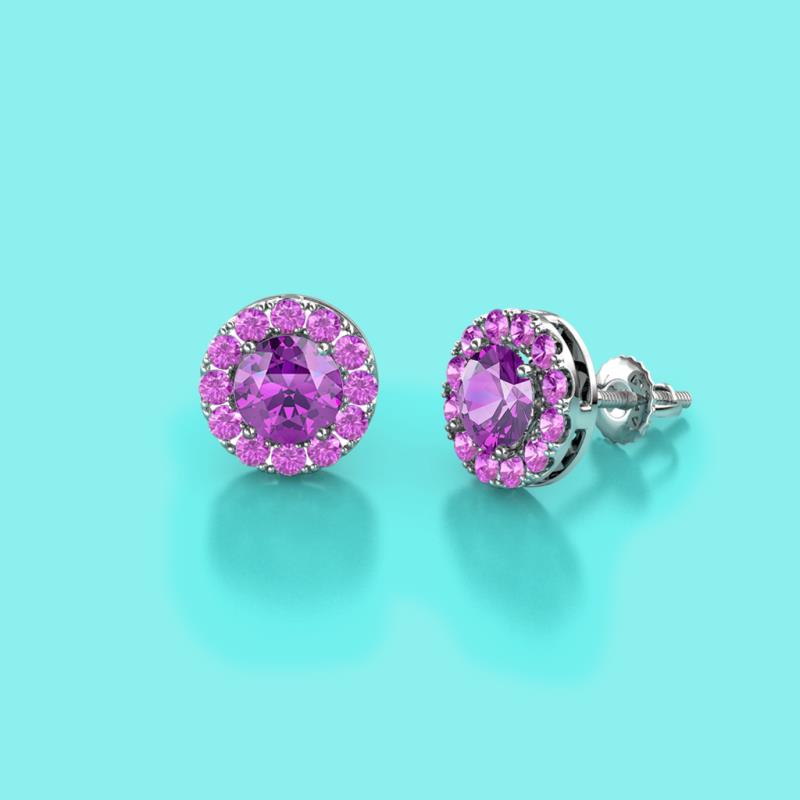 This Beautiful 0.71 ctw Halo Style Studs features Center Blue Sapphire surrounded with Small Amethyst which are designed to add a touch of Style and Elegance to just about any Outfit.