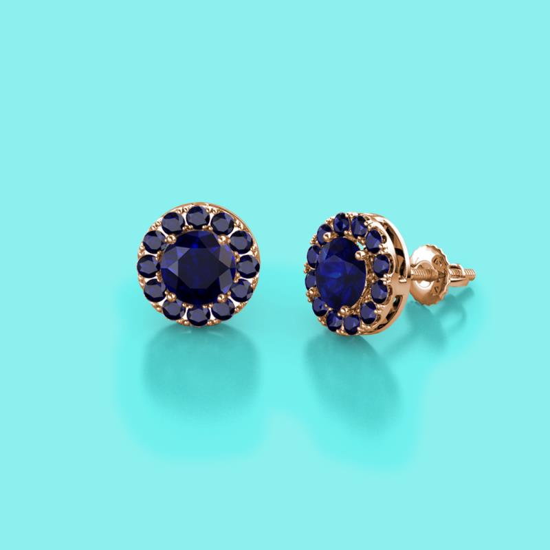 This Beautiful 0.96 ctw Halo Style Studs features Center Blue Sapphire surrounded with Small Blue Sapphire which are designed to add a touch of Style and Elegance to just about any Outfit.