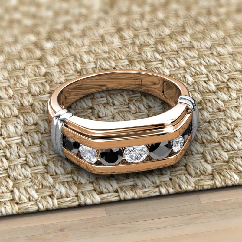 Presenting Black and White Lab Grown Diamond Channel set Men Wedding Ring in 10K Rose Gold with White Bars on the side to give Two Tone look. The White Bar on the side is White plated on 10K Rose Gold, it could wear off with time.