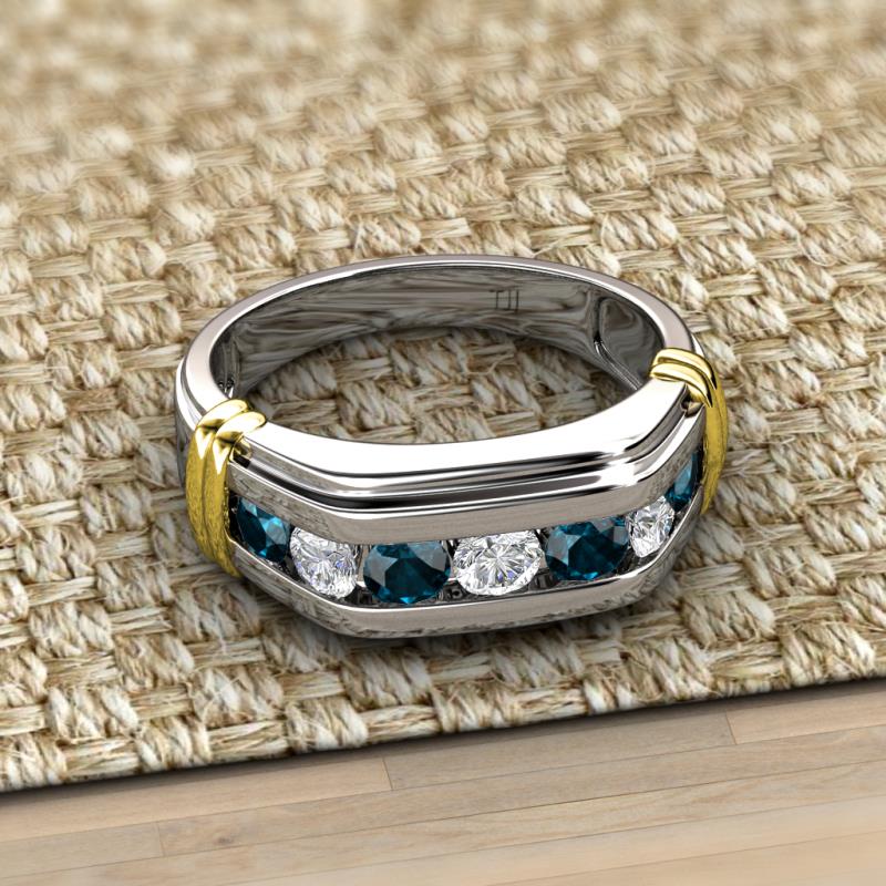 Presenting Blue and White Lab Grown Diamond Channel set Men Wedding Ring in 18K White Gold with Yellow Bars on the side to give Two Tone look. The Yellow Bar on the side is Yellow plated on 18K White Gold, it could wear off with time.