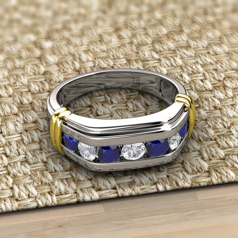 Presenting Blue Sapphire and Lab Grown Diamond Channel set Men Wedding Ring in 10K White Gold with Yellow Bars on the side to give Two Tone look. The Yellow Bar on the side is Yellow plated on 10K White Gold, it could wear off with time.