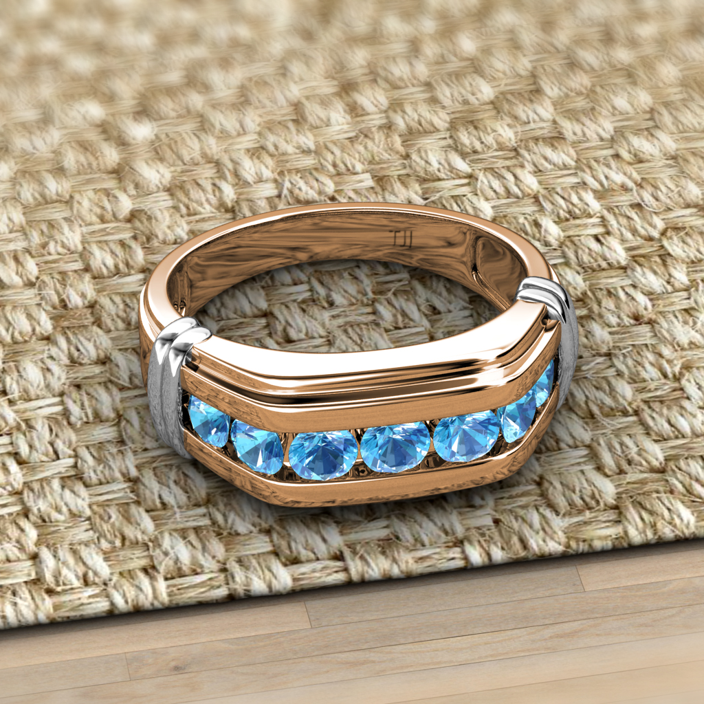 Presenting Blue Topaz Channel set Men Wedding Ring in 10K Rose Gold with White Bars on the side to give Two Tone look. The White Bar on the side is White plated on 10K Rose Gold, it could wear off with time.