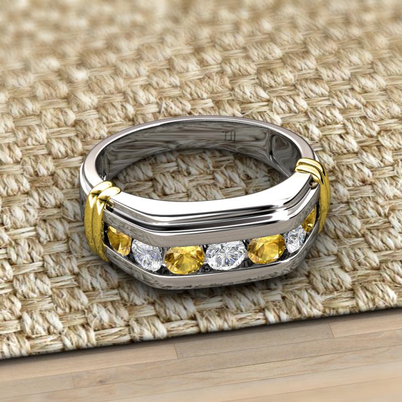 Presenting Citrine and Lab Grown Diamond Channel set Men Wedding Ring in Platinum with Yellow Bars on the side to give Two Tone look. The Yellow Bar on the side is Yellow plated on Platinum, it could wear off with time.