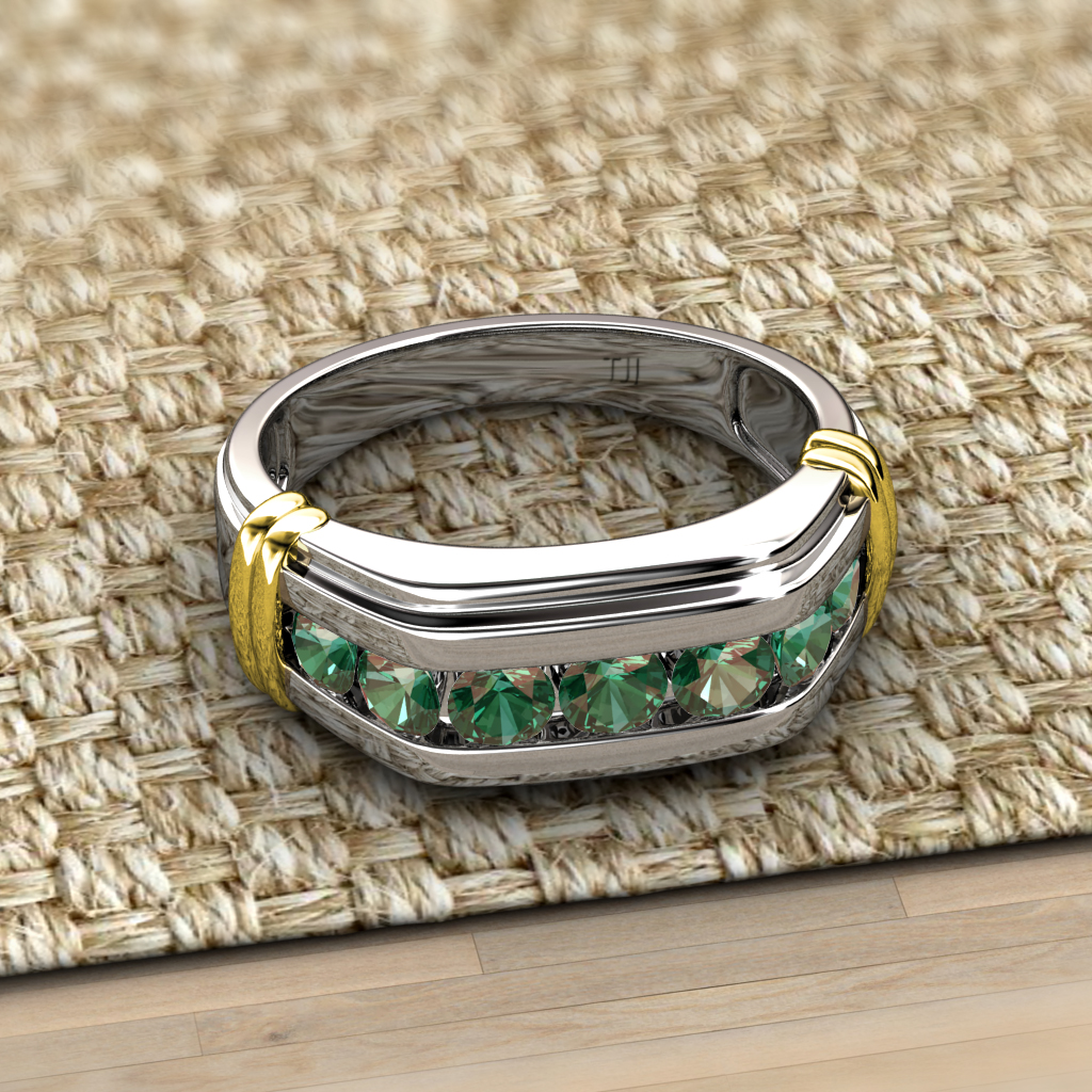 Presenting Created Alexandrite Channel set Men Wedding Ring in 18K White Gold with Yellow Bars on the side to give Two Tone look. The Yellow Bar on the side is Yellow plated on 18K White Gold, it could wear off with time.