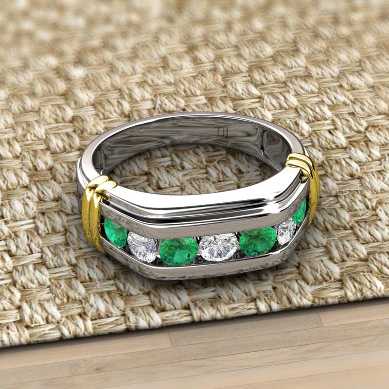 Presenting Emerald and Lab Grown Diamond Channel set Men Wedding Ring in 18K White Gold with Yellow Bars on the side to give Two Tone look. The Yellow Bar on the side is Yellow plated on 18K White Gold, it could wear off with time.