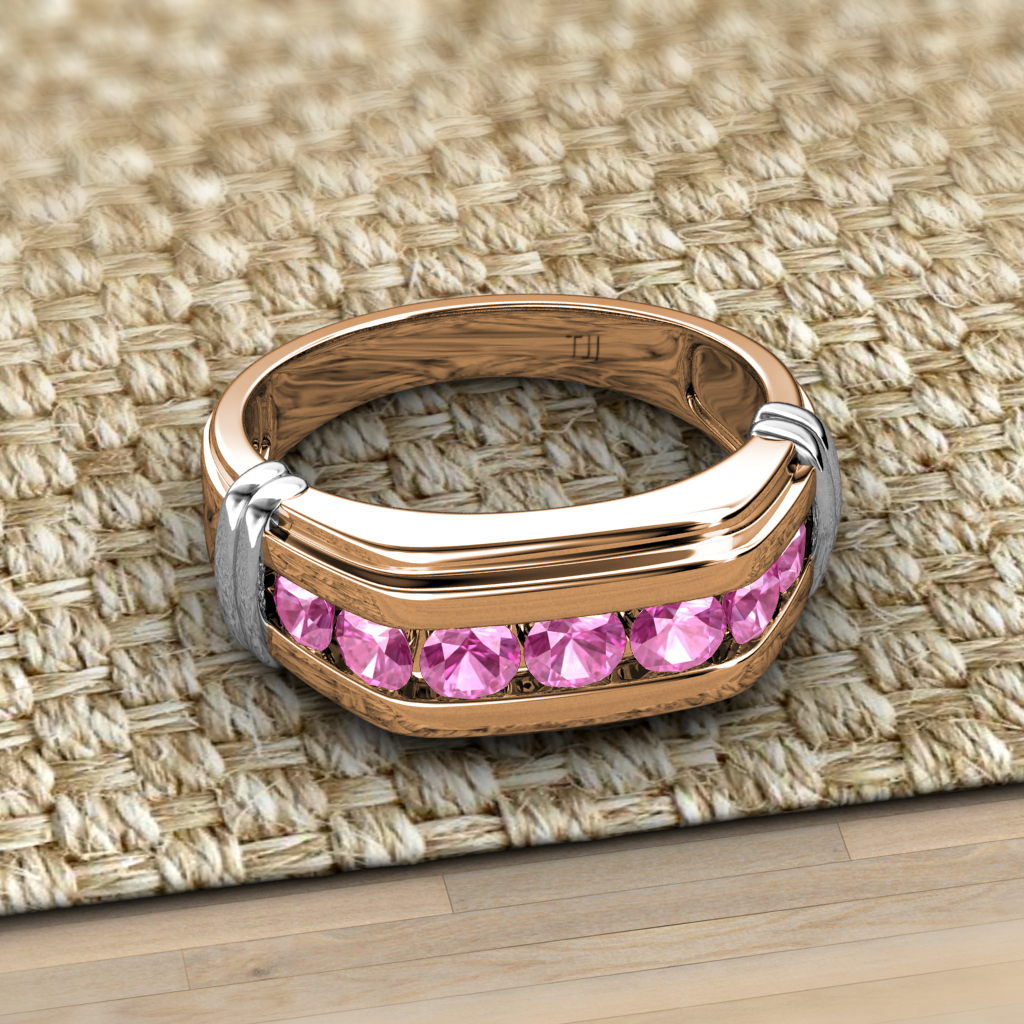 Presenting Pink Sapphire Channel set Men Wedding Ring in 10K Rose Gold with White Bars on the side to give Two Tone look. The White Bar on the side is White plated on 10K Rose Gold, it could wear off with time.