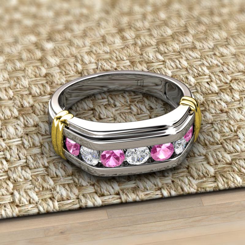Presenting Pink Sapphire and Lab Grown Diamond Channel set Men Wedding Ring in 18K White Gold with Yellow Bars on the side to give Two Tone look. The Yellow Bar on the side is Yellow plated on 18K White Gold, it could wear off with time.