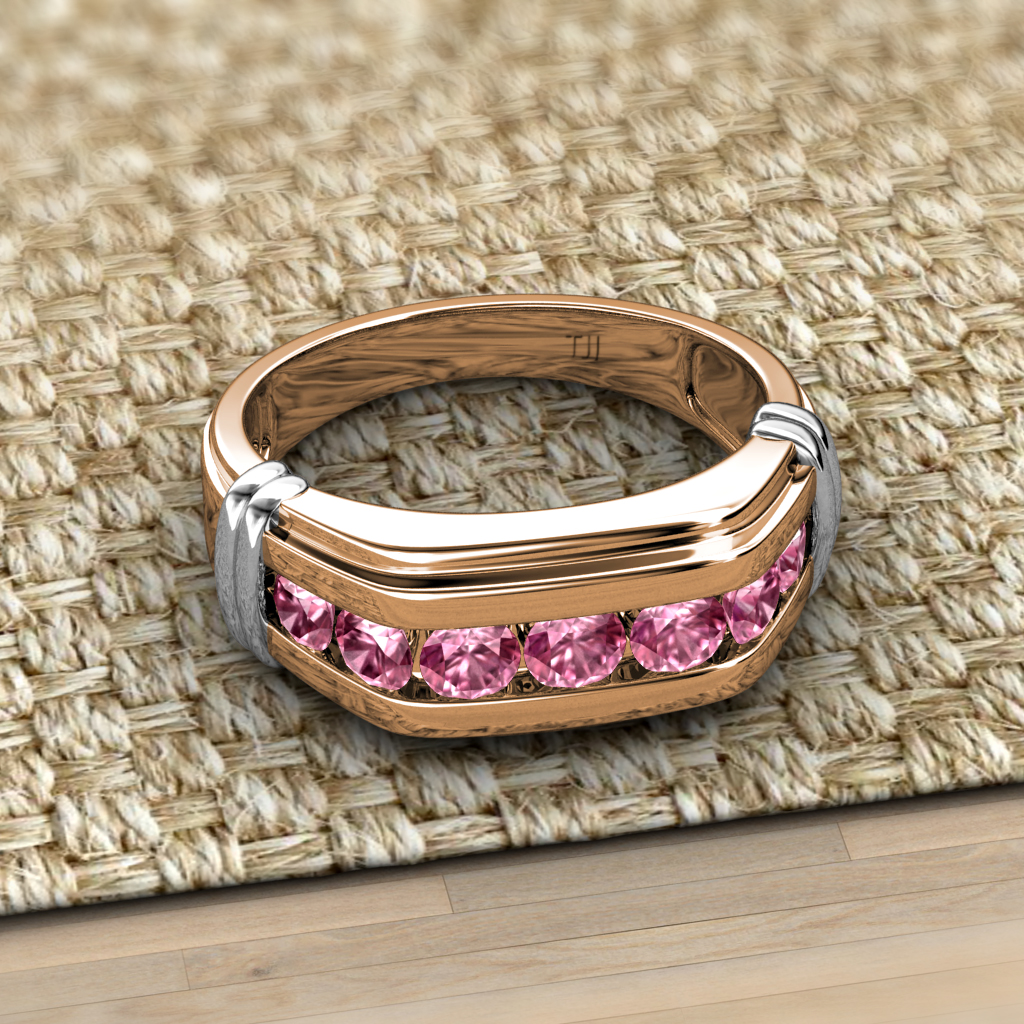 Presenting Pink Tourmaline Channel set Men Wedding Ring in 14K Rose Gold with White Bars on the side to give Two Tone look. The White Bar on the side is White plated on 14K Rose Gold, it could wear off with time.