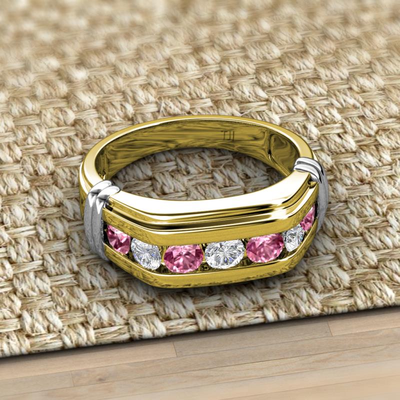 Round 1.05 ctw Pink Tourmaline and Lab Grown Diamond 7 Stone Channel Set Men Wedding Ring in 18K Yellow Gold More Details ...
