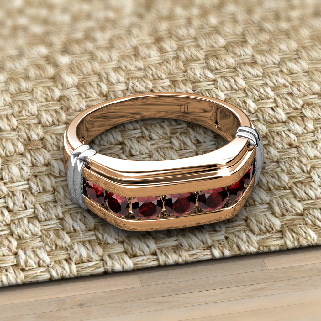 Presenting Red Garnet Channel set Men Wedding Ring in 14K Rose Gold with White Bars on the side to give Two Tone look. The White Bar on the side is White plated on 14K Rose Gold, it could wear off with time.
