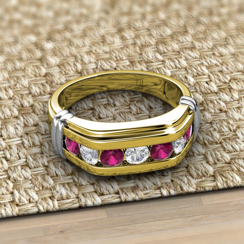 Presenting Rhodolite Garnet and Lab Grown Diamond Channel set Men Wedding Ring in 10K Yellow Gold with White Bars on the side to give Two Tone look. The White Bar on the side is White plated on 10K Yellow Gold, it could wear off with time.